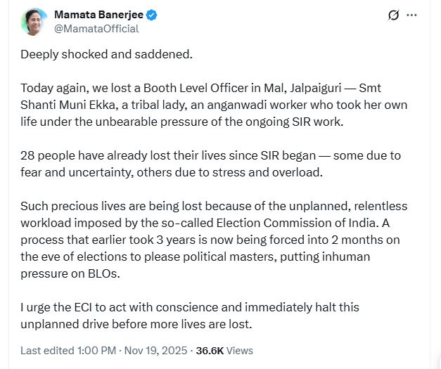 उन्होंने आगे लिखा, एसआईआर (SIR) शुरू होने के बाद से अब तक 28 लोग अपनी जान गंवा चुके हैं, कुछ डर और अनिश्चितता के कारण, तो कुछ तनाव और काम के बोझ के कारण।तथाकथित भारतीय चुनाव आयोग द्वारा लगाए गए अनियोजित और अथक कार्यभार के कारण इतनी कीमती जानें जा रही हैं। एक प्रक्रिया जो पहले 3 साल में पूरी होती थी, अब राजनीतिक आकाओं को खुश करने के लिए चुनाव से ठीक पहले 2 महीने में पूरी की जा रही है, जिससे बीएलओ पर अमानवीय दबाव पड़ रहा है। मैं चुनाव आयोग से आग्रह करती हूं कि वह विवेक से काम ले और और जानें जाने से पहले इस अनियोजित अभियान को तुरंत रोके।