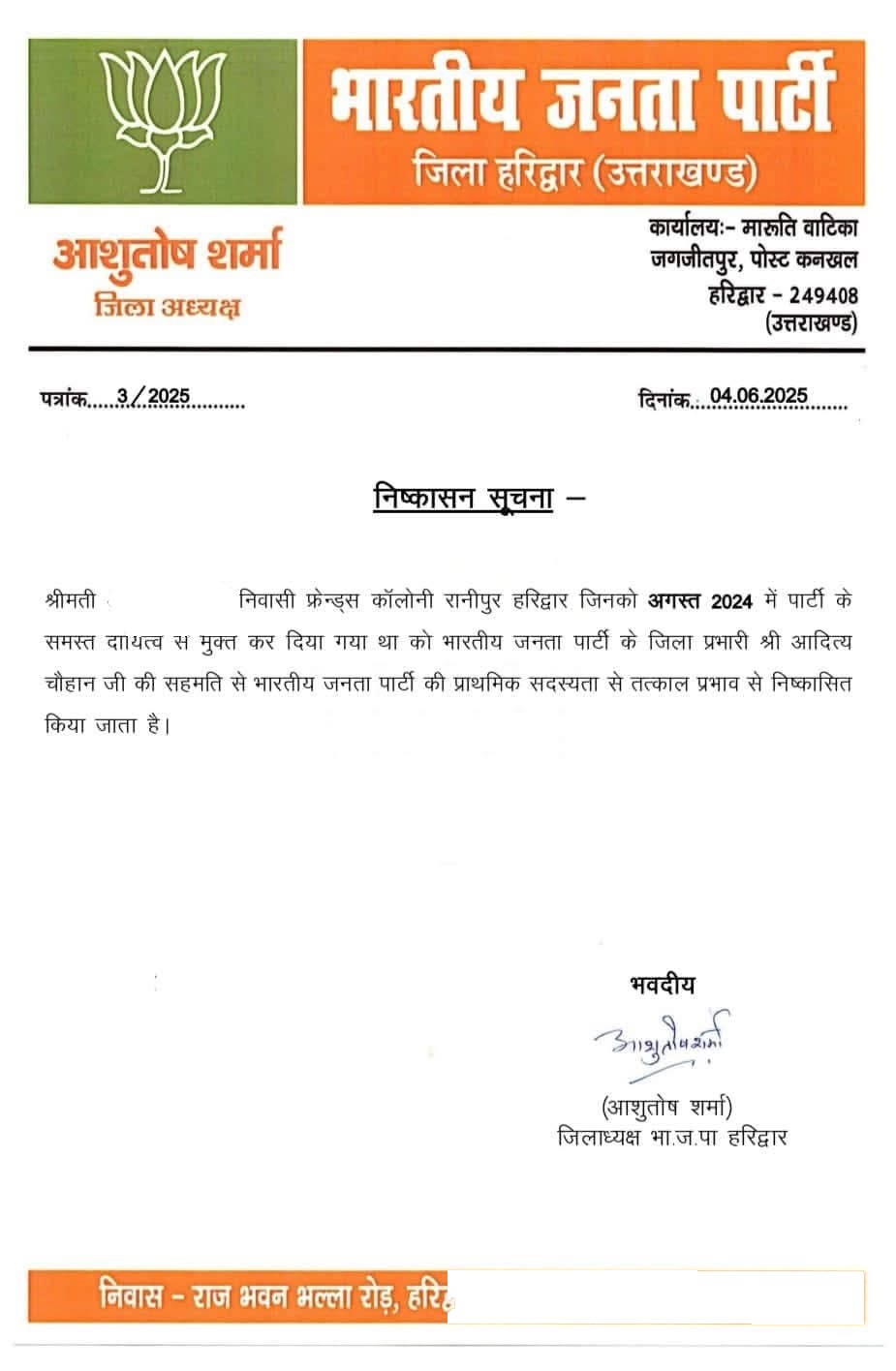 मामले के सामने आने के बाद भाजपा के जिलाध्यक्ष आशुतोष शर्मा की ओर से बुधवार को जारी पत्र कर की प्राथमिक सदस्यता से निष्कासित कर दिया गया है। पत्र में बताया गया है कि इससे पहले 2024 में भाजपा ने महिला नेता को महत्वपूर्ण पद से भी हटा दिया था। एक मीडिया रिपोर्ट की मानें तो आरोपी महिला के भाजपा महिला मोर्चा को पदाधिकारी बनने पर तीखा विरोध हुआ था। कई वरिष्ठ भाजपा नेत्रियों ने इसका खुला विरोध कर कार्यक्रमों में आना भी बंद कर दिया था।