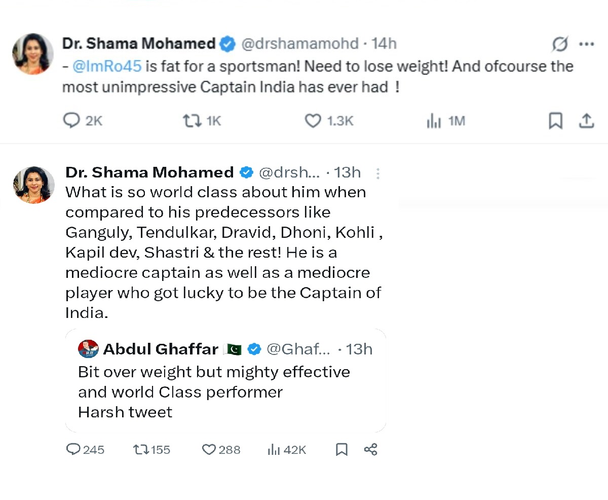 Shama Mohammed's controversial comment on Rohit Sharma: रोहित शर्मा की कप्तानी में भारतीय क्रिकेट टीम ने शानदार प्रदर्शन करते हुए चैंपियंस ट्रॉफी 2025 के सेमी-फाइनल में जगह बना ली है। भारतीय टीम ने रविवार को न्यूजीलैंड को 44 रनों से मात दी और टीम की यह लगातार तीसरी जीत रही है। वहीं, जीत के जश्न के बीच कांग्रेस की एक महिला नेता ने रोहित को लेकर अपमानजनक टिप्पणी की है। जिसको लेकर फैंस में काफी नाराजगी है।