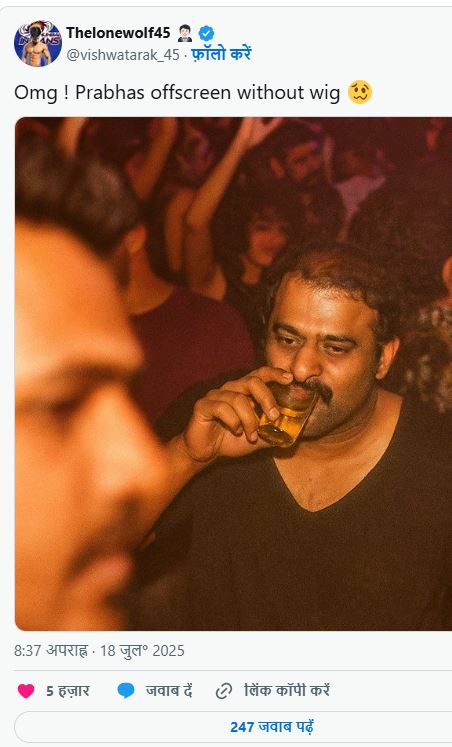 बताते चले कि जो तस्वीर सोशल मीडिया पर वायरल हुई है उसमें एक्टर को बिना बाल के देखा जा सकता है। वह एक पार्टी में ड्रिंक करते हुए दिखाई दे रहे हैं और उनके सिर पर बहुत कम बाल दिखे रहे हैं। इस तस्वीर को शेयर करते हुए कैप्शन में लिखा गया बिना विग के प्रभास। जब एक्टर का यह हाल लोगों ने देखा तो वह चिंता में आ गए और उनसे सेहत से जुड़े सवाल करने लगे। लोगों ने यह सवाल भी कर लिया कि क्या वह विग लगाते हैं। मीडिया रिपोर्ट्स के अनुसार टीम का कहना है कि यह फोटो रियल नहीं है बल्कि एआई जेनरेटेड है। उनके बाल होने की खबर झूठी है और लोगों को कंफ्यूज करने के लिए तस्वीर फैलाई जा रही है। एक्टर ने अब तक इस बारे में कुछ भी नहीं कहा है।