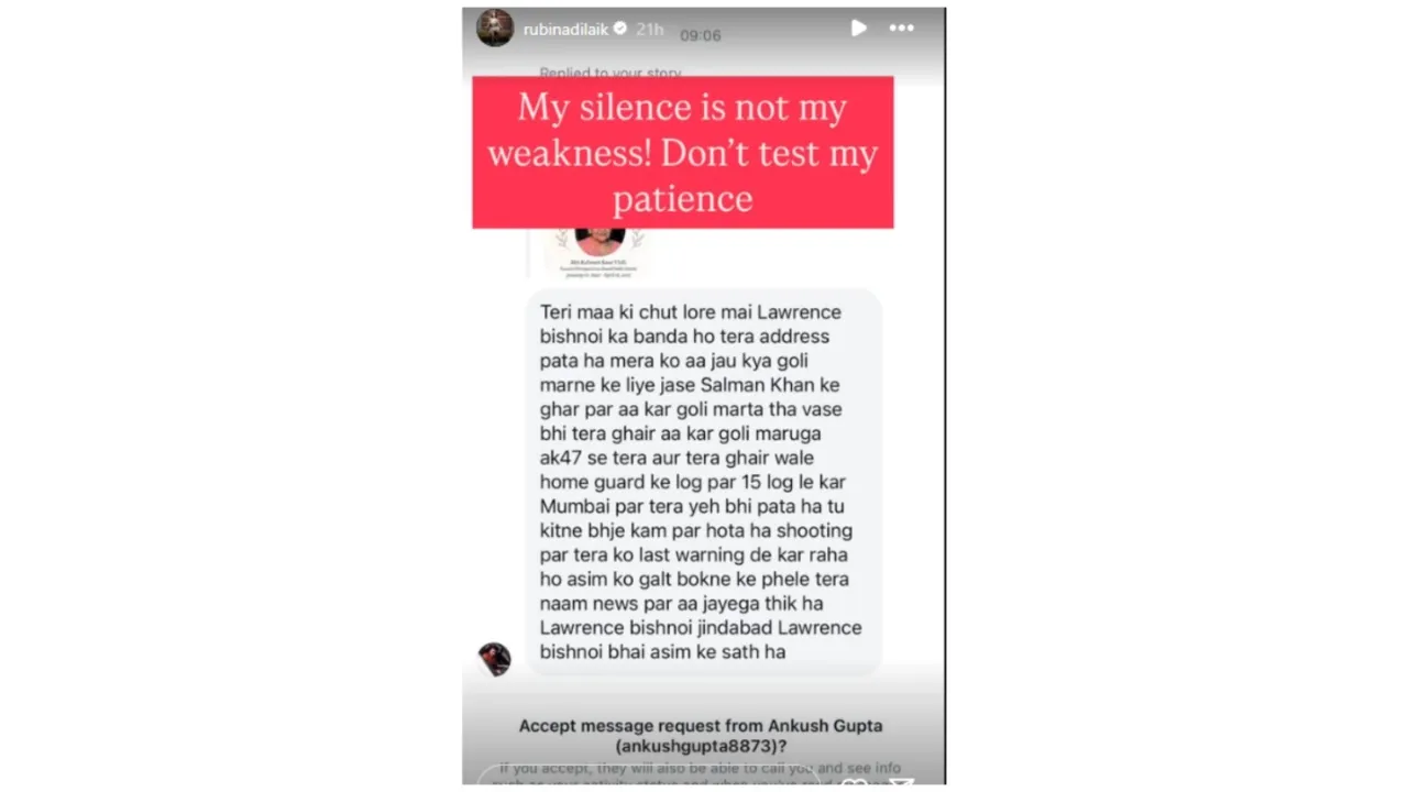 वहीं अभिनव शुक्ला ने जान से मारने की धमकी भरा मैसेज भेजने वाले के इंस्टाग्राम प्रोफाइल का स्क्रीन रिकॉर्डेड वीडियो भी शेयर किया है और बताया कि वह व्यक्ति चंडीगढ़ का लग रहा है. ऐसे में उन्होंने अपने पोस्ट में पंजाब और चंडीगढ़ पुलिस को टैग करते हुए उस शख्स की पहचान और उसके खिलाफ सख्त कार्रवाई करने की मांग की है. इसी बीच अब रुबीना दिलैक ने अपने पति को मिल रही धमकियों पर अपना गुस्सा जाहिर किया है.आसिम के फैन के धमकी भरे मैसेज का स्क्रीनशॉट शेयर करते हुए रुबीना दिलैक ने लिखा है- ‘मेरी खामोशी मेरी कमजोरी नहीं है. मेरे धैर्य की परीक्षा मत लो.’