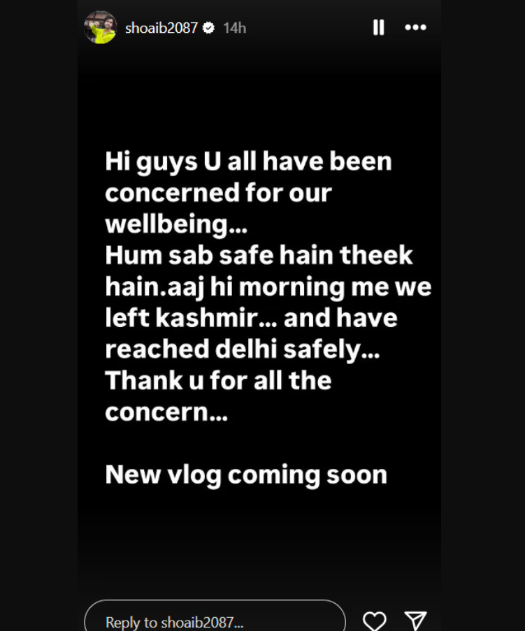दरअसल शोएब इब्राहिम ने मंगलवार को अपने इंस्टाग्राम हैंडल पर अपने फैंस के साथ शेयर किया कि वे सुरक्षित हैं. इंस्टाग्राम स्टोरी पर उन्होंने लिखा, “हाय दोस्तों, आप सभी हमारी सेफ्टी को लेकर परेशान हैं… हम सब सुरक्षित हैं ठीक हैं, आज सुबह ही हम कश्मीर से निकल गए… और हम सुरक्षित रूप से दिल्ली पहुँच गए… आप सभी की चिंता के लिए धन्यवाद.. नया व्लॉग जल्द ही आ रहा है.”