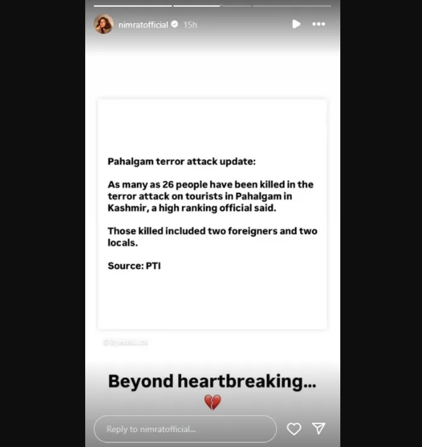 आपको बता दें कि अक्षय कुमार से लेकर विक्की कौशल, रुपाली गांगुली, देवोलीना भट्टाचार्जी और हिना खान जैसे स्टार्स ने हमले की कड़ी निंदा की और पीड़ितों की ओर सांत्वना दिखाई है. ऐसे में इस आतंकी हमले ने बॉलीवुड एक्ट्रेस निम्रत कौर के भी जख्मों को हरा कर दिया है. बता दें, निम्रत कौर ने इस हमले पर रिएक्शन देते हुए लिखा, ‘दिल टूटने से भी ज्यादा बुरा’.