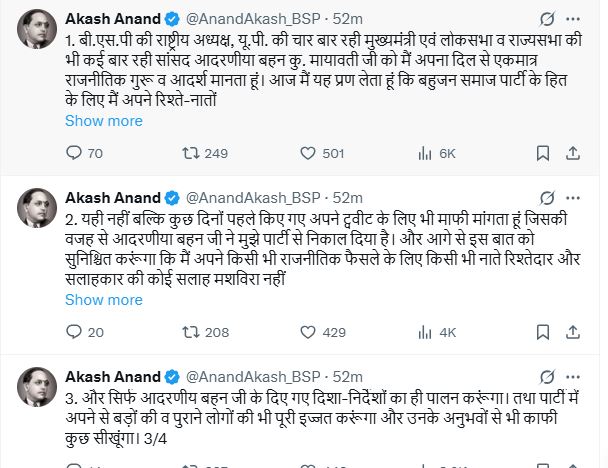 यही नहीं बल्कि कुछ दिनों पहले किए गए अपने ट्ववीट के लिए भी माफी मांगता हूं जिसकी वजह से आदरणीया बहन जी ने मुझे पार्टी से निकाल दिया है। और आगे से इस बात को सुनिश्चित करूंगा कि मैं अपने किसी भी राजनीतिक फैसले के लिए किसी भी नाते रिश्तेदार और सलाहकार की कोई सलाह मशविरा नहीं लूंगा। और सिर्फ आदरणीय बहन जी के दिए गए दिशा-निर्देशों का ही पालन करूंगा। तथा पार्टी में अपने से बड़ों की व पुराने लोगों की भी पूरी इज्जत करूंगा और उनके अनुभवों से भी काफी कुछ सीखूंगा।