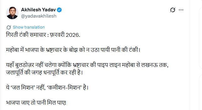 अखिलेश यादव ( Akhilesh Yadav) ने एक्स पर लिखा कि गिरती टंकी समाचार : फ़रवरी 2026। महोबा में भाजपा के भ्रष्टाचार के बोझ को न उठा पायी पानी की टंकी। यादव ने कहा कि यहां बुलडोज़र नहीं चलेगा क्योंकि भ्रष्टाचार की पाइप लाइन महोबा से लखनऊ तक, जलापूर्ति की जगह धनापूर्ति कर रही है। ये ‘जल मिशन’ नहीं, ‘कमीशन-मिशन’ है। भाजपा जाए तो पानी मिल पाए।
