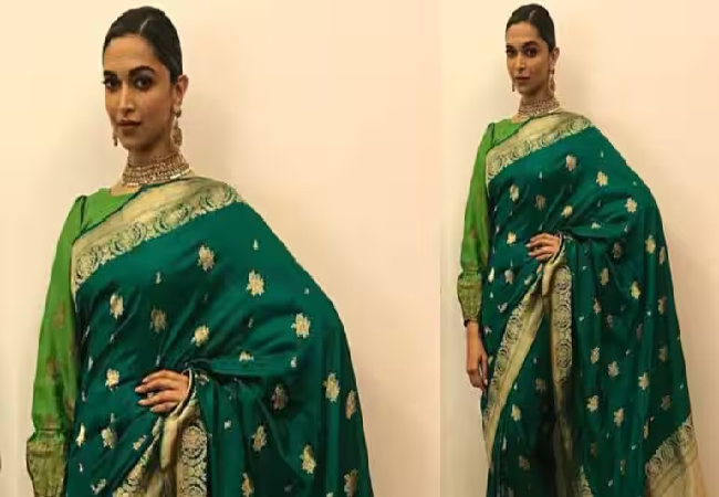 दीपिका की तरह बॉटल ग्रीन शेड की भारी बॉर्डर वाली बनारसी साड़ी चुनें। आप कंट्रास्टिंग रंगों के साथ इसे मैच कर सकती हैं या अपने साड़ी के बॉर्डर के साथ सिंक कर सकती हैं।