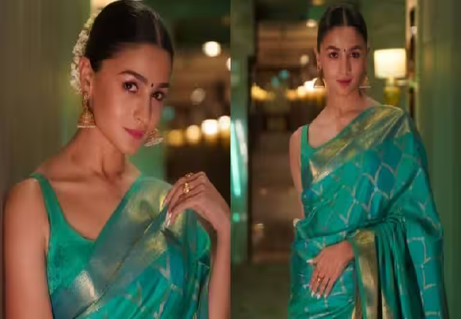 आलिया भट्ट जैसी हल्की कढ़ाई और सुनहरे बॉर्डर वाली हरी साड़ी त्योहारी सीजन में बिलकुल सही है। स्लीवलेस ब्लाउज़ के साथ ये लुक मॉडर्न और क्लासी दोनों लगेगा।