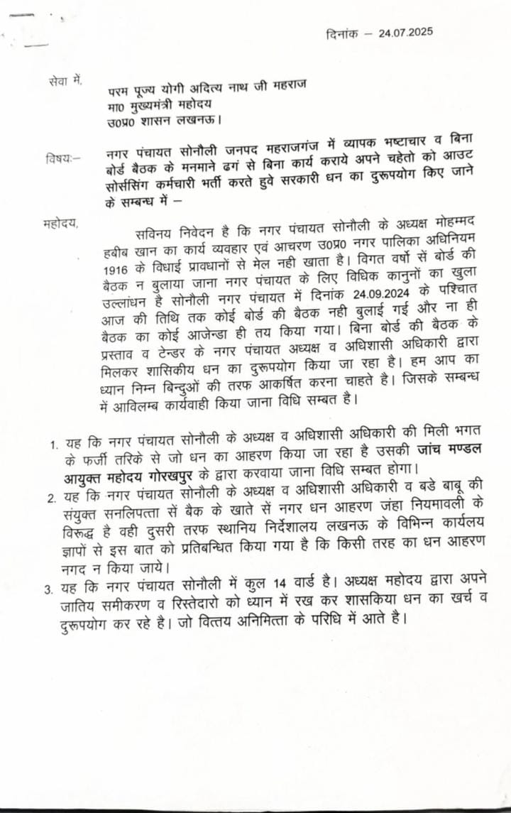 पर्दाफाश न्यूज़ ब्यूरो महराजगंज :: नगर पंचायत सोनौली में भ्रष्टाचार और वित्तीय अनियमितताओं का मामला प्रकाश में आया है। नगर पंचायत के कई सभासदों ने अध्यक्ष मोहम्मद हबीब खान और अधिशासी अधिकारी पर गंभीर आरोप लगाते हुए मुख्यमंत्री योगी आदित्यनाथ को ज्ञापन सौंपा। सभासदों का कहना है कि नगर पंचायत में पिछले लगभग एक साल से बिना बोर्ड बैठक बुलाए मनमाने ढंग से कार्य किए जा रहे हैं और सरकारी धन का खुलकर दुरुपयोग किया जा रहा है।