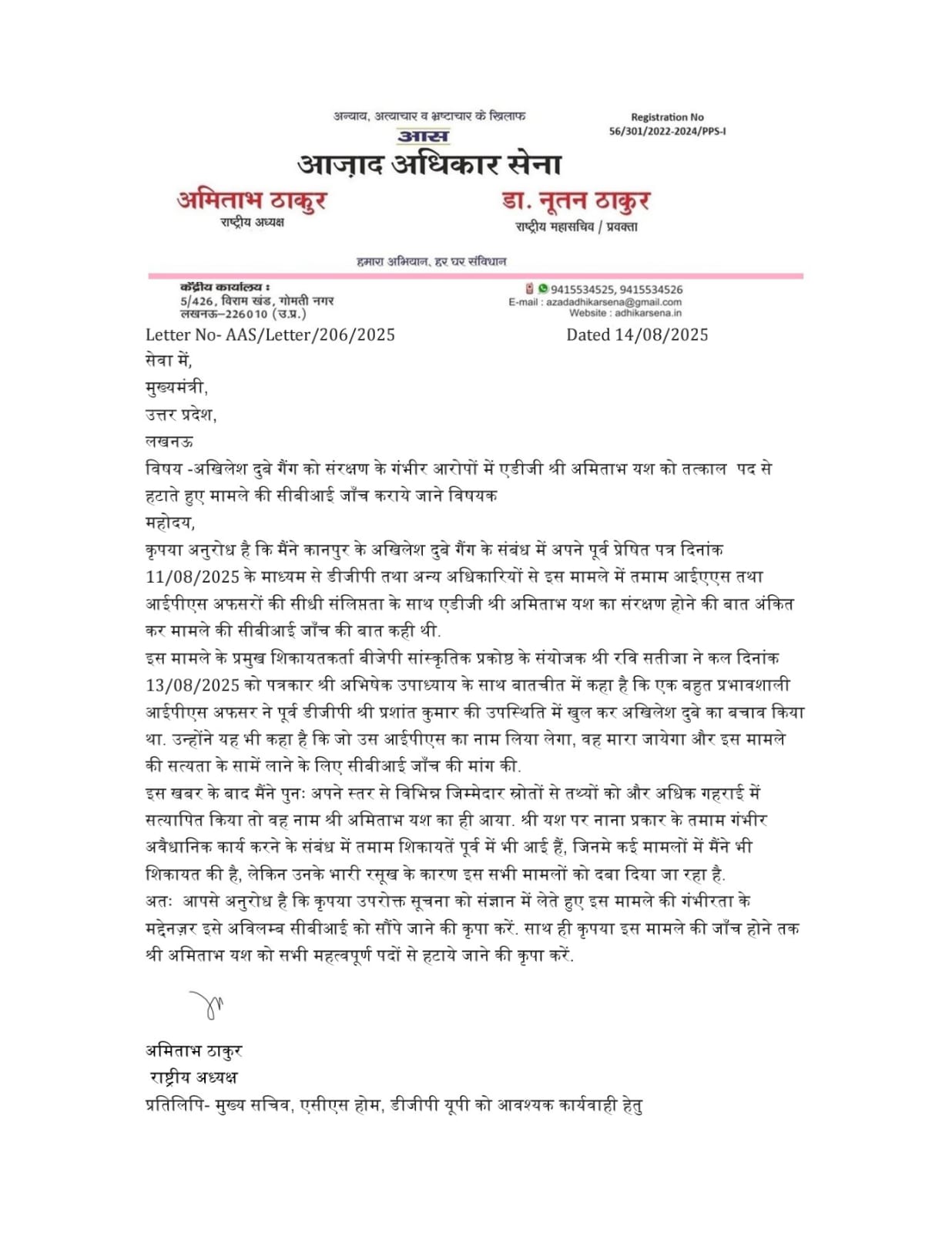 आजाद अधिकार सेना के राष्ट्रीय अध्यक्ष व पूर्व IPS अमिताभ ठाकुर (Amitabh Thakur) ने अब ADG लॉ एंड ऑर्डर अमिताभ यश पर गंभीर आरोप लगाते हुए सीएम योगी आदित्यनाथ (CM Yogi Adityanath) को पत्र भेजा है। अपने पत्र में उन्होंने आरोप लगाया है कि कानपुर के कुख्यात अपराधी व अधिवक्ता अखिलेश दुबे को एडीजी स्तर से संरक्षण मिल रहा है।