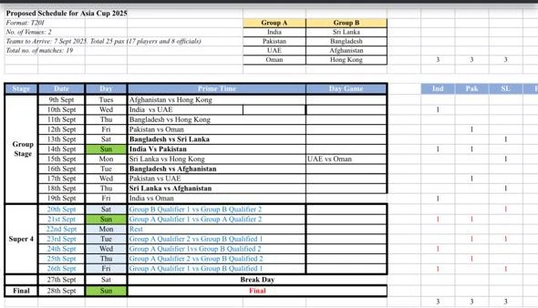 एशिया कप 2025 (Asia Cup 2025) का शनिवार को शेड्यूल सामने आ गया है। 9 सितंबर से लेकर 28 सितंबर तक यूएई में टूर्नामेंट खेला जाएगा। भारत-पाक के बीच मुकाबला 14 सितंबर को खेला जाएगा। भारत और पाकिस्तान (India-Pakistan) को एक ही ग्रुप में रखा गया है।