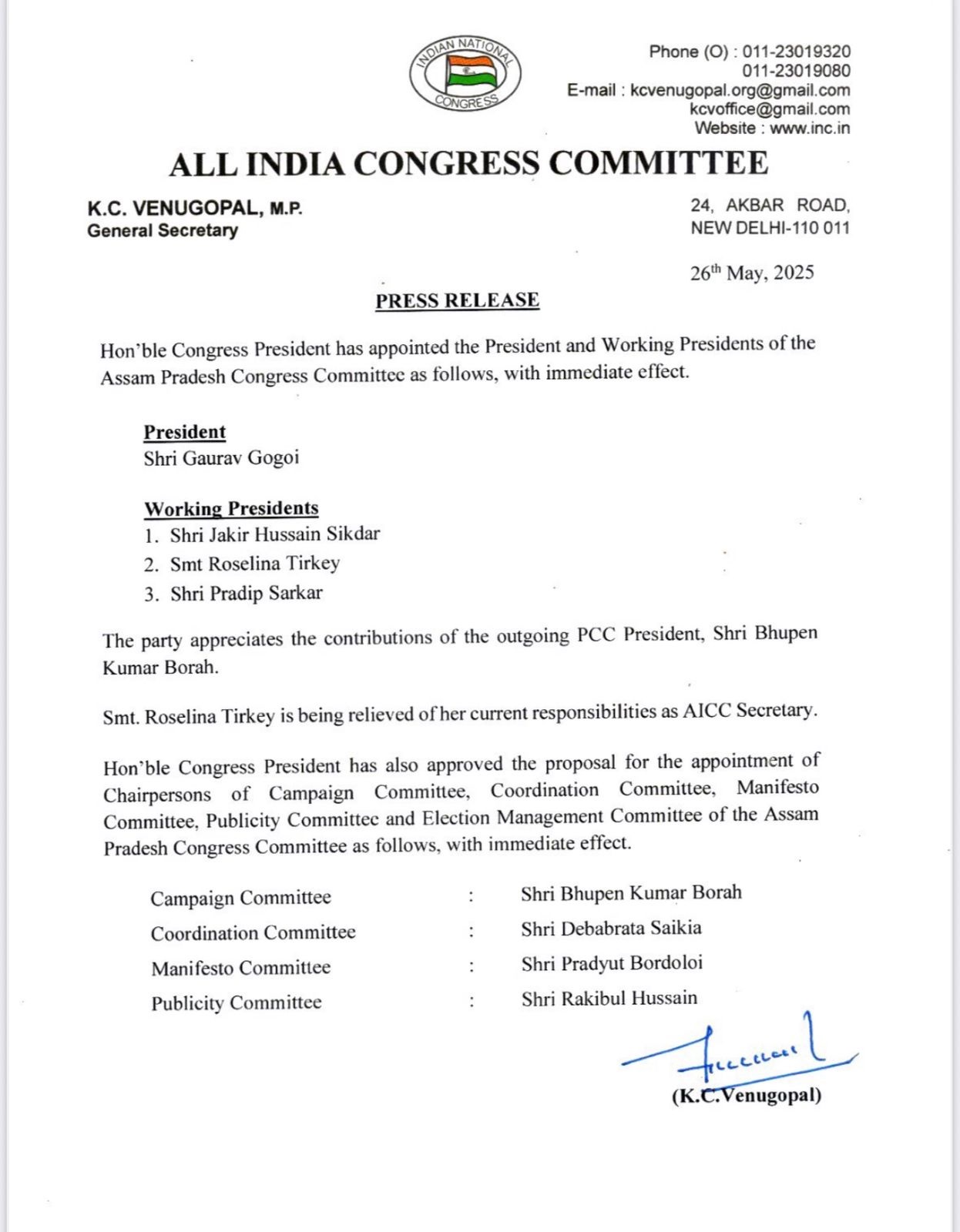 कांग्रेस पार्टी के संगठन महासचिव केसी वेणुगोपाल की ओर से इसकी जानकारी दी गयी है। इसमें बताया गया है कि, कांग्रेस अध्यक्ष मल्लिकार्जुन खरगे ने गौरव गोगोई को असम प्रदेश कांग्रेस कमेटी का अध्यक्ष नियुक्त किया है। साथ ही तीन नेताओं को कार्यकारी अध्यक्ष की जिम्मेदारी सौंपी है। जाकिर हुसैन सिकदर, रोजलीना टिर्की और प्रदीप सरकार को पार्टी की असम इकाई का कार्यकारी अध्यक्ष बनाया गया है।