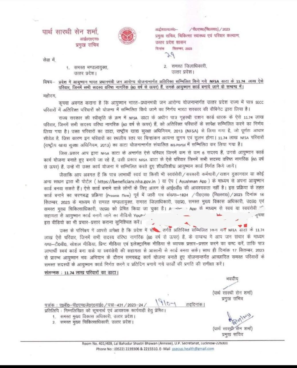 यूपी में अब 60 वर्ष से अधिक आयु के सभी व्यक्तियों के लिए आयुष्मान कार्ड बनाए जाने का आदेश जारी किया गया है। प्रमुख सचिव, स्वास्थ्य, पार्थ सारथी सेन शर्मा ने सभी कमिश्नरों और जिलाधिकारियों को पत्र भेजकर इस निर्देश को लागू करने को कहा है।