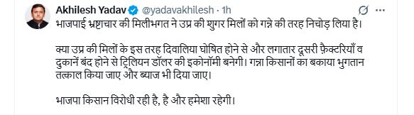 समाजवादी पार्टी (Samajwadi Party) के राष्ट्रीय अध्यक्ष अखिलेश यादव (Akhilesh Yadav) ने एक्स पोस्ट पर ये खबर शेयर करते हुए लिखा कि भाजपाई भ्रष्टाचार की मिलीभगत ने उप्र की शुगर मिलों को गन्ने की तरह निचोड़ लिया है। उन्होंने कहा कि क्या उप्र की मिलों के इस तरह दिवालिया घोषित होने से और लगातार दूसरी फ़ैक्टरियां व दुकानें बंद होने से ट्रिलियन डॉलर की इकोनॉमी बनेगी। गन्ना किसानों का बकाया भुगतान तत्काल किया जाए और ब्याज भी दिया जाए। अखिलेश यादव (Akhilesh Yadav) ने कहा कि भाजपा किसान विरोधी रही है, है और हमेशा रहेगी।