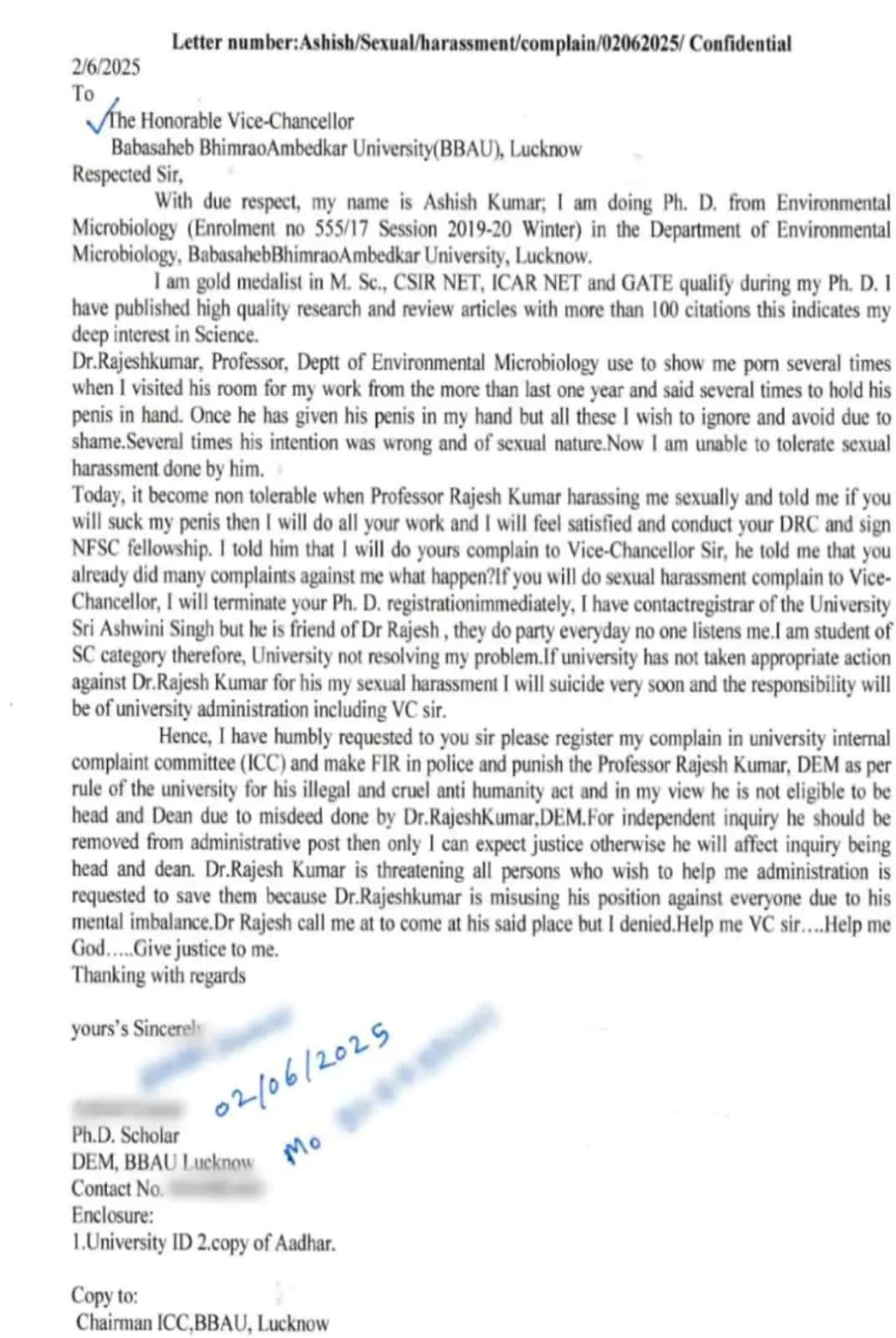 अब मैं यौन उत्पीड़न (Sexual Harassment) बर्दाश्त नहीं कर पा रहा हूं। एक दिन तो उन्होंने कहा कि तुम यदि ओरल सेक्स करो तो मैं तुम्हारे NFSC फैलोशिप पर हस्ताक्षर कर दूंगा। बाबा साहब भीमराव आंबेडकर केंद्रीय विश्वविद्यालय (BBAU) के रिसर्च स्कॉलर ने कुलपति को पत्र लिखकर अपने गाइड और विभाग के डीन प्रो.राजेश कुमार पर यह गंभीर आरोप लगाए गए हैं।