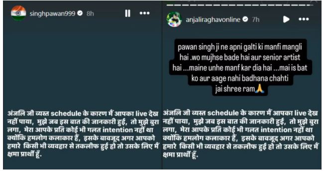 पवन सिंह (Pawan Singh) ने अपने ऑफिशियल इंस्टाग्राम अकाउंट पर एक स्टोरी शेयर कर एक्ट्रेस अंजलि राघव से माफी मांगी है। उन्होंने लिखा है, ‘अंजलि जी व्यस्त शेड्यूल के कारण मैं आपका लाइव देख नहीं पाया, मुझे जब इस बात की जानकारी हुई, तो मुझे बुरा लगा। मेरा आपके प्रति कोई भी गलत इंटेशन नहीं था, क्योंकि हम लोग कलाकार हैं, इसके बावजूद अगर आपको हमारे किसी भी व्यवहार से तकलीफ हुई हो तो उसके लिए मैं क्षमा प्रार्थी हूं।’