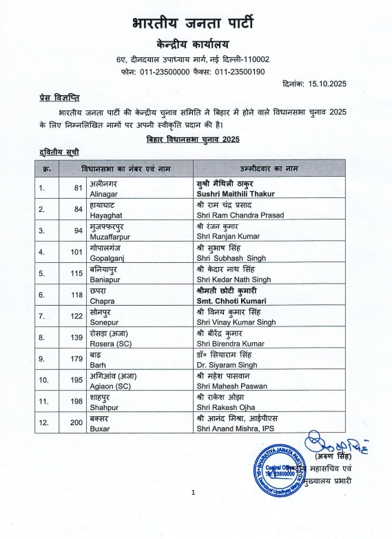 Bihar BJP List: बिहार चुनाव के लिए भाजपा ने आज उम्मीदवारों की दूसरी लिस्ट जारी कर दी है। दूसरी लिस्ट में 12 उम्मीदवारों के नाम का एलान किया गया है। इसमें मैथिली ठाकुर को भी प्रत्याशी बनाया गया है। मैथिली ठाकुर को अलीनगर से प्रत्याशी बनाया गया है। बता दें कि, एक दिन पहले भी मैथिली ठाकुर औपचारिक रूप से भाजपा में शामिल हुईं थीं।