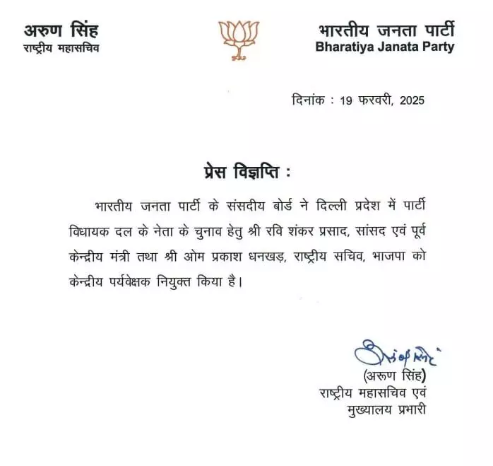 भाजपा सांसद रविशंकर प्रसाद (Ravi Shankar Prasad) और पार्टी के राष्ट्रीय सचिव ओम प्रकाश धनखड़ (Party's national secretary Om Prakash Dhankar) को दिल्ली भाजपा विधायक दल (Delhi BJP Legislature Party) का नेता चुनने के लिए केंद्रीय पर्यवेक्षक नियुक्त (Central Observers Appointed) किया गया है।