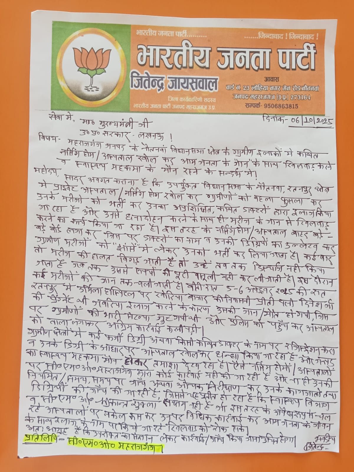 पर्दाफाश न्यूज़ ब्यूरो महराजगंज :: नौतनवा नगर के वरिष्ठ भाजपा नेता जितेंद्र जायसवाल ने मुख्यमंत्री योगी आदित्यनाथ, स्वास्थ्य मंत्री बृजेश पाठक और जिला अधिकारी महराजगंज को एक लिखित शिकायती पत्र ईमेल के माध्यम से भेजा है।