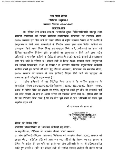 उत्तर प्रदेश शासन चिकित्सा अनुभाग-2 डा. हरिदत्त नेमी ( वक्र0-10182) तत्कालीन मुख्य चिकित्साधिकारी, कानपुर नगर सम्प्रति निलम्बित एवं सम्बद्ध कार्यालय महानिदेशक चिकित्सा एवं स्वास्थ्य सेवाएं, उप्र लखनऊ द्वारा रिक्त पदों की चयन प्रक्रिया में राष्ट्रीय स्वास्थ्य मिशन के दिशा-निर्देशों अनुपालन न किये जाने। शासनादेशों के विपरीत शासन द्वारा प्रदत्त वित्तीय शक्तियों का प्रत्याहरण किये जाने, नियम विरुद्ध स्थानान्तरण किये जाने, अधीनस्थों पर लचर एवं शिथिल प्रशासनिक नियंत्रण होने। उच्चादेशों का अनुपालन न किये जाने तथा पदीय अधिकारों व शासकीय कर्तव्यों के निर्वह्न में लापरवाही बरतने इत्यादि आरोपों में प्रथमदृष्टया दोषी पाये जाने के दृष्टिगत डा. हरिदत नेमी के विरुद्ध उप्र सरकारी सेवक (अनुशासन एवं अपील) नियमावली, 1999 के नियम-7 के अन्तर्गत विभागीय अनुशासनिक कार्यवाही संस्थित करते हुए आरोपों की जांच हेतु निदेशक (प्रशासन), चिकित्सा एवं स्वास्थ्य सेवाएं, उप्र लखनऊ को पदनाम से जांच अधिकारी नियुक्त किये जाने की एतद्द्वारा राज्यपाल सहर्ष स्वीकृति प्रदान करते हैं।