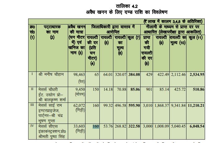 CAG की रिपोर्ट में बताया गया है कि, छात्र शक्ति इंफ्रा-कंस्ट्रक्शन को नीलामी में 3000 रुपये प्रति घनमीटर की दर से पत्थर खनन का पट्टा मिला थां इसकी रायल्ट 160 रुपये तय थी। हालांकि, कंपनी ने 33,604 घनमीटर गिट्टी का खनन कर लिया। ये मामला सामने आया तो अधिकारियों ने मिलीभगत कर बसपा विधायक और उनकी पत्नी की कंपनी को बचाते हुए सरकारी राजस्व को नुकसान पहुंचाने की योजना बना दी। अधिकारियों ने रायलटी मूल्य के सापेक्ष 5 गुना जुर्माना वसूलने का काम किया, जबकि जुर्माने का निधारण नीलामी दर से होनी चाहिए थी। हालांकि, अधिकारियों ने ऐसा करते हुए सरकारी राजस्व को नुकसान पहुंचाया है।