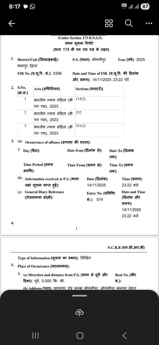 इस दौरान जब आस पास के लोग बीच बचाव करने आए तो आरोपी जान से मारने की धमकी देते हुए फरार हो गए। मारपीट का पूरा वीडियो सोशल मीडिया पर वायरल हो गया है, जिसमे हमलावर बुरी तरह से पीड़ितों को पीट रहे है। वहीं पीड़ित ने जब कानपुर देहात के भोगनीपुर थाने में तहरीर दी तो पहले पुलिस ने मामले को टरका दिया। सोशल मीडिया पर वीडियो वायरल होने के बाद पुलिस ने उकसावे में हमला करना, धमकी देना और स्वेच्छा से चोट पहुंचाने की धारा में मुकदमा दर्ज कर लिया।