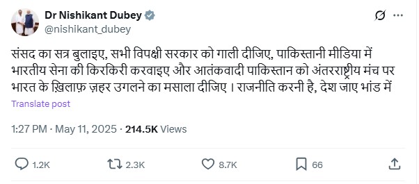 दरअसल, कांग्रेस नेता सचिन पायलट ने दोनों देशों के बीच सीजफायर की घोषणा अमेरिका की ओर से किए जाने पर सवाल खड़े किए। इसके बाद भाजपा सांसद निशिकांत दुबे ने रविवार को सोशल मीडिया प्लेटफॉर्म एक्स पर लिखा, “संसद का सत्र बुलाइए, सभी विपक्षी सरकार को गाली दीजिए, पाकिस्तानी मीडिया में भारतीय सेना की किरकिरी करवाइए और आतंकवादी पाकिस्तान को अंतरराष्ट्रीय मंच पर भारत के ख़िलाफ़ ज़हर उगलने का मसाला दीजिए। राजनीति करनी है, देश जाए भांड में।”