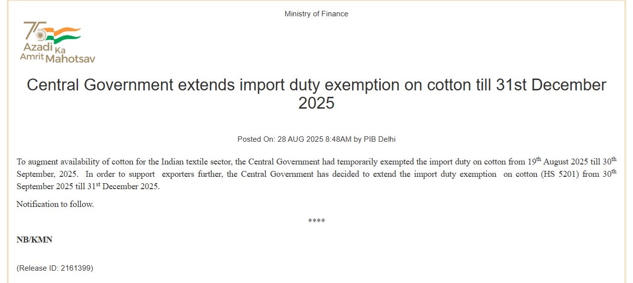 केंद्रीय वित्तीय मंत्रालय ने गुरुवार (28 अगस्त, 2025) को एक बयान में मंकहा, “निर्यातकों को और अधिक समर्थन देने के लिए, केंद्र सरकार ने कपास (एचएस 5201) पर आयात शुल्क छूट को 30 सितंबर, 2025 से 31 दिसंबर, 2025 तक बढ़ाने का फैसला किया है।” इसमें 5 प्रतिशत मूल सीमा शुल्क (बीसीडी) और 5 प्रतिशत कृषि अवसंरचना एवं विकास उपकर (एआईडीसी) से छूट, साथ ही दोनों पर 10 प्रतिशत सामाजिक कल्याण अधिभार शामिल है, जिसके कारण कपास पर कुल मिलाकर 11 प्रतिशत आयात शुल्क हो गया।