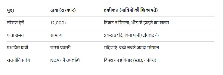 रेल मंत्री अश्विनी वैष्णव और बिहार के उपमुख्यमंत्री सम्राट चौधरी का दावा है कि छठ के लिए 12,000 से ज्यादा स्पेशल ट्रेनें चलाई गई हैं, जबकि जमीनी हकीकत कुछ और बयान कर रही है। भीड़ इस कदर बढ़ गई है कि भागलपुर, गया, पटना, पूर्णिया जैसे स्टेशनों पर यात्री संख्या 30 फीसदी तक बढ़ गई है।