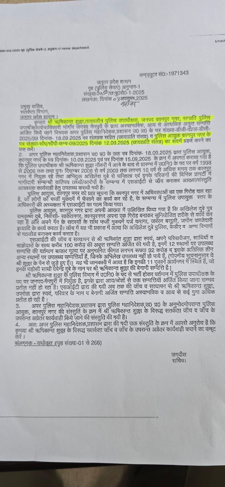 पत्र के मुताबिक, वर्तमान में मैनपुरी के भोगांव सीओ पद पर तैनात ऋषिकांत ने अस्वाभाविक आय से अत्यधिक अकूत संपत्ति जुटाई है। एसआईटी जांच (SIT Investigation) में सामने आया है कि ऋषिकांत ने स्वयं और अपने परिजनों, साथियों और साझेदारों के साथ करीब 100 करोड़ की संपत्ति अर्जित की है। 12 स्थानों पर उपलब्ध संपत्तियों का वर्तमान बाजार मूल्य लगभग 92 करोड़ है। इनकी ग्यारह दुकानें आर्यनगर में हैं, जो पड़ोसी साथी देवेंद्र दुबे का नाम पर हैं।
