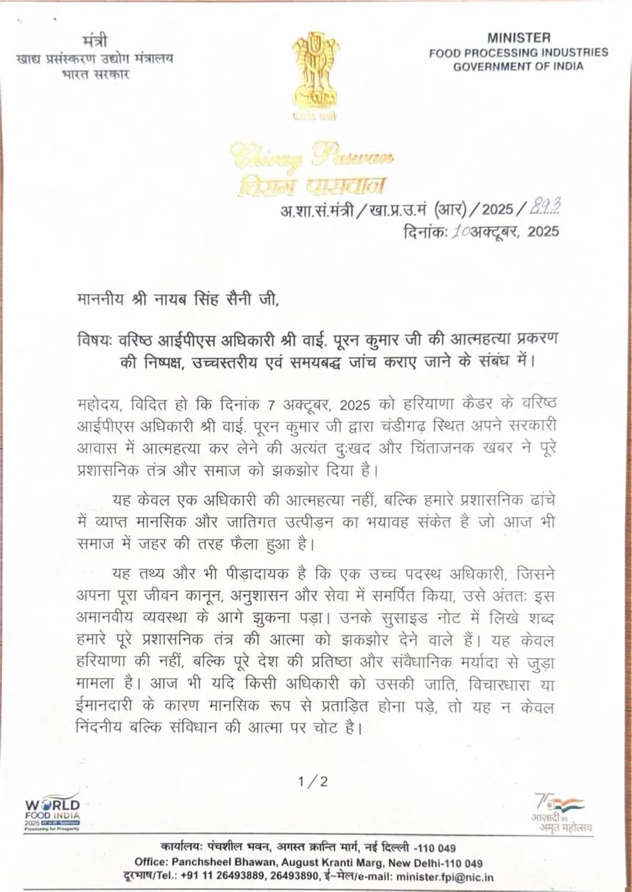 पत्र में चिराग ने आगे लिखा कि आज भी यदि किसी अधिकारी को उसकी जाति, विचारधारा या ईमानदारी के कारण मानसिक रूप से प्रताड़ित होना पड़े, तो यह न केवल निंदनीय बल्कि संविधान की आत्मा पर चोट है। यह घटना किसी राजनीतिक या प्रशासनिक बहस का विषय नहीं, बल्कि मानवता, न्याय और समानता के मूल्यों की परीक्षा है। इस मामले में सख्त, पारदर्शी और निर्भीक कार्रवाई पूरे देश यह संदेश देगी कि कानून से ऊपर कोई नहीं है- न पद न प्रतिष्ठा, न प्रभाव। ऐसे संवेदनशील मामलों में निष्पक्ष कार्रवाई न केवल एक अधिकारी के प्रति न्याय सुनिश्चित करेगी, बल्कि यह संदेश भी देगी कि हरियाणा सरकार अपने प्रशासनिक अधिकारियों की गरिमा, सुरक्षा और सम्मान की रक्षा के लिए पूर्ण रूप से प्रतिबद्ध है। इस प्रकरण में किसी को भी बख्शा नहीं जाना चाहिए, चाहे वह कितना भी बड़ा पद या प्रभावशाली स्थिति क्यों न रखता हो। आशा है कि आप इस गंभीर विषय को सर्वोच्च प्राथमिकता देते हुए न्याय के इस संघर्ष में सकारात्मक एवं दृढ़ भूमिका निभाते हुए पीड़ित परिवार को न्याय दिलवाने की कृपा करेंगे।