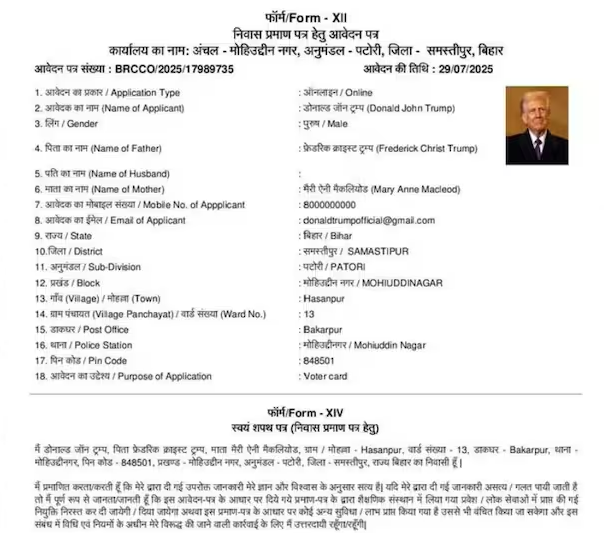आवेदन पत्र पर डोनाल्ड ट्रंप की फोटो के साथ कई पर्सनल जानकारियां दी गई हैं। यह मामला सामने आने के बाद तुरंत इस पर एक्शन लिया गया। रिपोर्ट्स के मुताबिक, राजस्व अधिकारी मोहिउद्दीननगर ने 4 अगस्त 2025 को ही इस आवेदन को रद्द कर दिया था। साथ ही एक अज्ञात व्यक्ति के खिलाफ साइबर थाने समस्तीपुर में FIR दर्ज हुई है। कहा जा रहा है कि ये सब गहन पुनरीक्षण (SIR) के काम को प्रभावित करने के लिए किया गया है। इस मामले पर प्रशासन की कड़ी नजर बनाए हुए है।