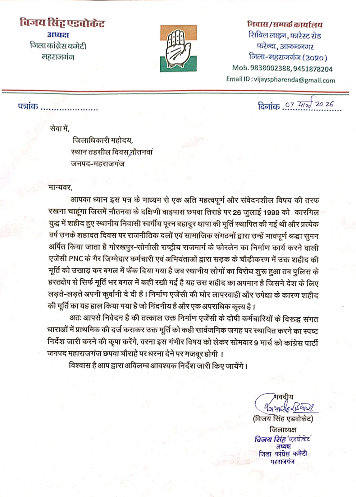 उन्होंने चेतावनी दी है कि यदि जल्द कार्रवाई नहीं हुई तो कांग्रेस पार्टी 9 मार्च को छपवा चौराहे पर धरना प्रदर्शन करेगी।