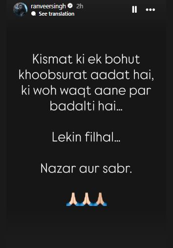सोमवार के दिन रणवीर सिंह (Ranveer singh) ने अपनी इंस्टाग्राम स्टोरी पर ‘धुरंधर’ का एक डायलॉग लिखा, “किस्मत की एक बहुत खूबसूरत आदत है कि वो वक्त आने पर बदलती है।” यूं तो फिल्म में ये डायलॉग आर माधवन के किरदार ने कहा है, लेकिन इंस्टा स्टोरीज पर उन्होंने ये डायलॉग पोस्ट कर लिखा, “लेकिन फिलहाल…नजर और सब्र।”