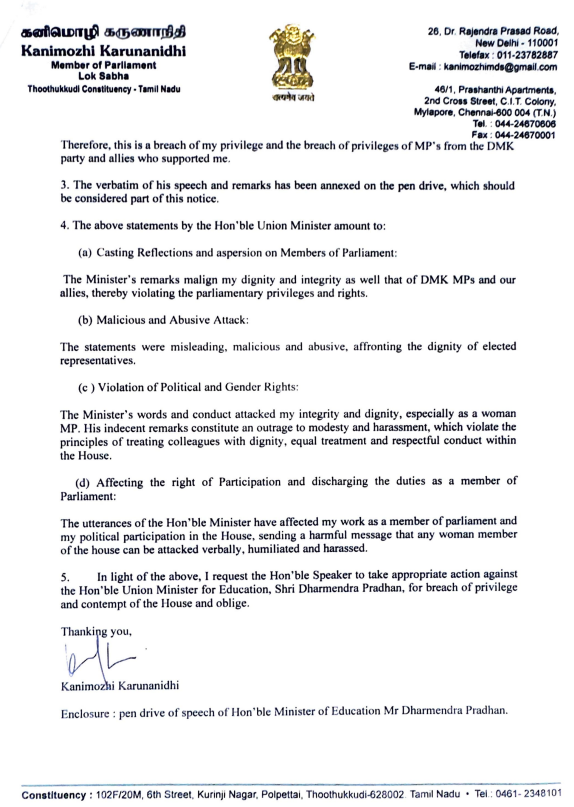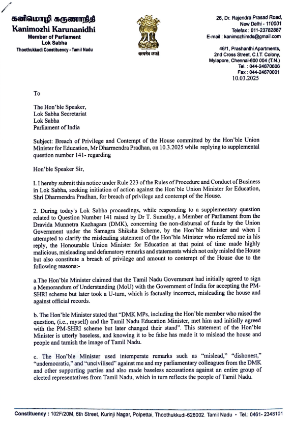 लोकसभा में बजट सत्र (Budget session in Lok Sabha) के दौरान डीएमके सांसद कनिमोझी (DMK MP Kanimozhi) ने केंद्रीय शिक्षा मंत्री और भाजपा सांसद धर्मेंद्र प्रधान (Union Education Minister Dharmendra Pradhan) के खिलाफ संसद में तीन भाषाओं के मुद्दे पर की गई टिप्पणी को लेकर संसदीय विशेषाधिकार हनन का नोटिस पेश (Moves Notice of Breach of Parliamentary Privilege) किया।