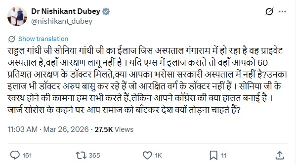 निशिकांत दुबे ने गुरुवार को आरक्षण के मुद्दे पर राहुल गांधी पर निशाना साधा और एक्स पोस्ट में लिखा, “राहुल गांधी जी सोनिया गांधी जी का ईलाज जिस अस्पताल गंगाराम में हो रहा है वह प्राइवेट अस्पताल है,वहाँ आरक्षण लागू नहीं है । यदि एम्स में इलाज कराते तो वहाँ आपको 60 प्रतिशत आरक्षण के डॉक्टर मिलते,क्या आपका भरोसा सरकारी अस्पताल में नहीं है?उनका इलाज भी डॉक्टर अरुप बासु कर रहे हैं जो आरक्षित वर्ग के डॉक्टर नहीं हैं । सोनिया जी के स्वस्थ होने की कामना हम सभी करते हैं,लेकिन आपने कॉग्रेस की क्या हालत बनाई है । जार्ज सोरोस के कहने पर आप समाज को बाँटकर देश क्यों तोड़ना चाहते हैं?”