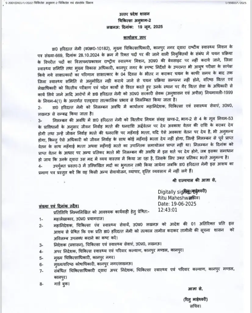 उत्तर प्रदेश के कानपुर के नगर के मुख्य चिकित्सा अधिकारी डॉक्टर हरीदत्त नेमी (Kanpur CMO Dr. Haridutt Nemi) को निलंबित कर दिया गया है। चिकित्सा अनुभाग दो (Medical Section 2) से जारी आदेश पत्र के अनुसार राष्ट्रीय स्वास्थ्य मिशन (National Health Mission) के अंतर्गत रिक्त पदों की भर्ती में अनियमिताएं बरते जाने के आरोप में निलंबित कर दिया गया है। जिन पर आरोप है कि राष्ट्रीय स्वास्थ्य मिशन (National Health Mission) के अंतर्गत रिक्त पदों की नियुक्तियों के संबंध में चयन प्रक्रिया का विज्ञापन राष्ट्रीय स्वास्थ्य मिशन (National Health Mission) उत्तर प्रदेश की वेबसाइट पर नहीं कराया गया था।