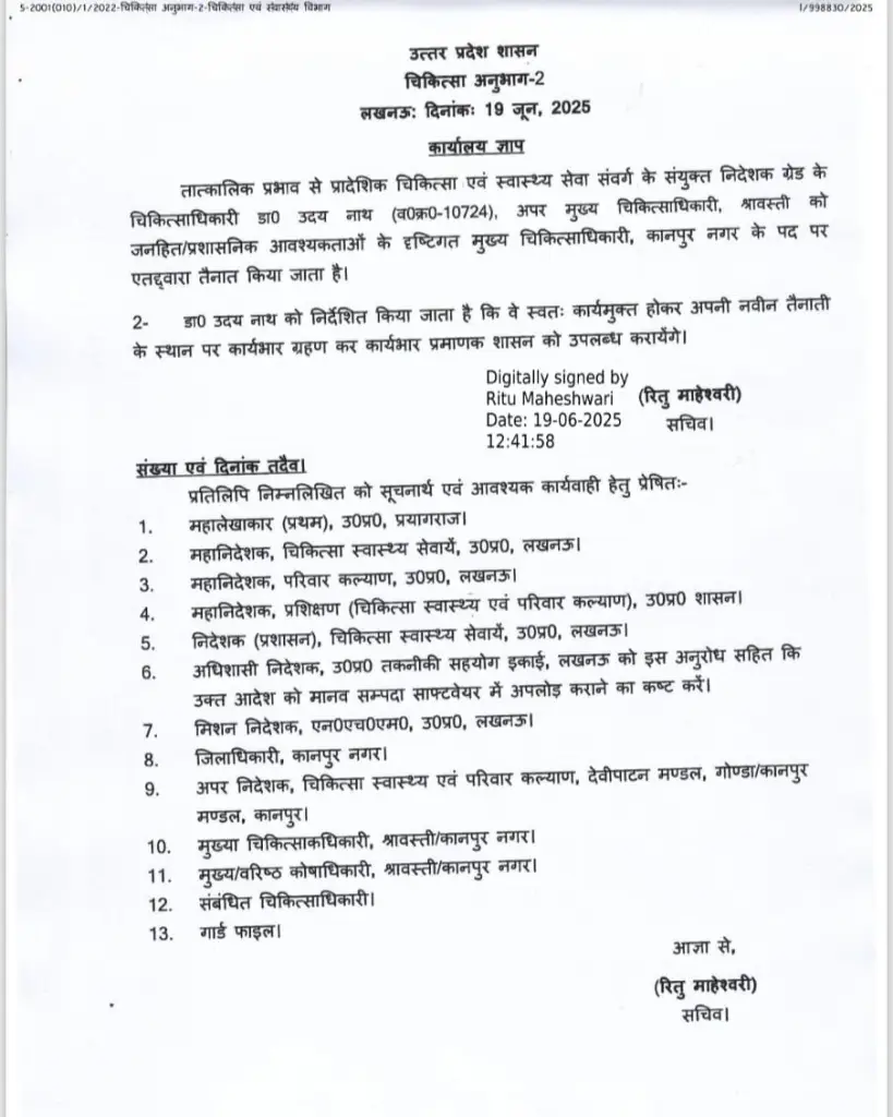 इसी के साथ अपर मुख्य चिकित्सा अधिकारी श्रावस्ती डॉक्टर उदयनाथ को कानपुर नगर का मुख्य चिकित्सा अधिकारी नियुक्त किया गया है। आदेश में यह भी बताया गया कि डॉक्टर उदयनाथ स्वत: कार्य मुक्त होकर अपनी नवीन तैनाती स्थल पर कार्यभार ग्रहण कर कार्यभार ग्रहण करने का प्रमाणक शासन को उपलब्ध करायें।