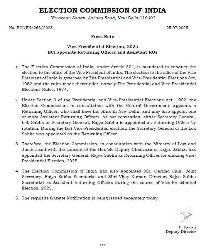नई दिल्ली। भारत निर्वाचन आयोग (Election Commission) ने उपराष्ट्रपति चुनाव (Vice Presidential Election) के लिए रिटर्निंग अधिकारियों और सहायक रिटर्निंग अधिकारियों की नियुक्ति की है। पिछले दिनों जगदीप धनखड़ के इस्तीफे के बाद उपराष्ट्रपति का पद खाली हो गया है। अब चुनाव आयोग (Election Commission) ने इलेक्शन करवाने की तैयारी शुरू कर दी है। आयोग ने उपराष्ट्रपति चुनाव (Vice Presidential Election) के लिए राज्यसभा सचिवालय (Rajya Sabha Secretariat) की संयुक्त सचिव गरिमा जैन और राज्यसभा सचिवालय के निदेशक विजय कुमार को सहायक रिटर्निंग अधिकारी नियुक्त किया है।