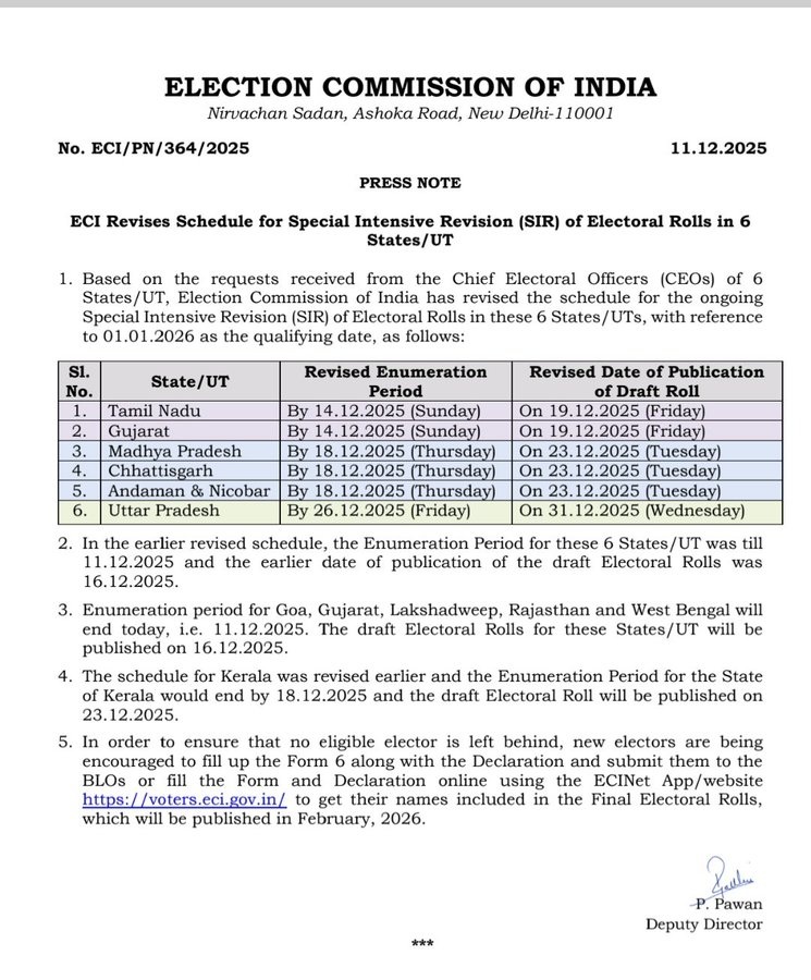 आयोग के अनुसार, तमिलनाडु और गुजरात में SIR जमा करने की नई अंतिम तिथि अब 14 दिसंबर 2025 (रविवार) होगी, जबकि इससे पहले यह 19 दिसंबर 2025 (शुक्रवार) थी। मध्य प्रदेश, छत्तीसगढ़ एवं अंडमान और निकोबार के लिए अंतिम तिथि 18 दिसंबर 2025 (गुरुवार) से बढ़ाकर 23 दिसंबर 2025 (मंगलवार) कर दी गई है। वहीं, यूपी में SIR की अंतिम तिथि 26 से बढ़कर 31 दिसंबर 2025 (बुधवार) कर दी गई है। चुनाव आयोग ने इन सभी राज्यों के नागरिकों से अपील की है कि वे बढ़ी हुई तारीख का लाभ उठाते हुए शीघ्र अपना काम पूरा कर लें।