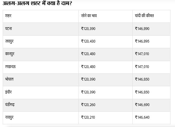 सुबह 9.25 बजे एमसीएक्स में 24 कैरेट सोने की कीमत 123,700 रुपये प्रति 10 ग्राम चल रही है। इसमें 404 रुपये प्रति 10 ग्राम की गिरावट है। सोने ने अब तक 123,463 रुपये प्रति 10 ग्राम का लो रिकॉर्ड और 123,728 रुपये प्रति 10 ग्राम का हाई रिकॉर्ड बनाया है। IBJA में कल शाम 24 कैरेट सोने की कीमत 123,350 रुपये प्रति 10 ग्राम दर्ज की गई है। वहीं 22 कैरेट सोने का भाव 12039 रुपये प्रति 10 ग्राम दर्ज किया गया है।
