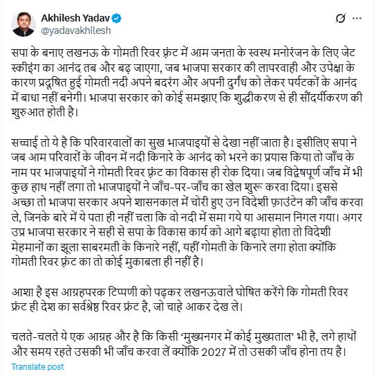 समाजवादी पार्टी के राष्ट्रीय अध्यक्ष अखिलेश यादव ने रविवार को एक्स पोस्ट पर लिखा कि सपा के बनाए लखनऊ के गोमती रिवर फ़्रंट में आम जनता के स्वस्थ मनोरंजन के लिए जेट स्कीइंग का आनंद तब और बढ़ जाएगा, जब भाजपा सरकार की लापरवाही और उपेक्षा के कारण प्रदूषित हुई गोमती नदी अपने बदरंग और अपनी दुर्गंध को लेकर पर्यटकों के आनंद में बाधा नहीं बनेगी।