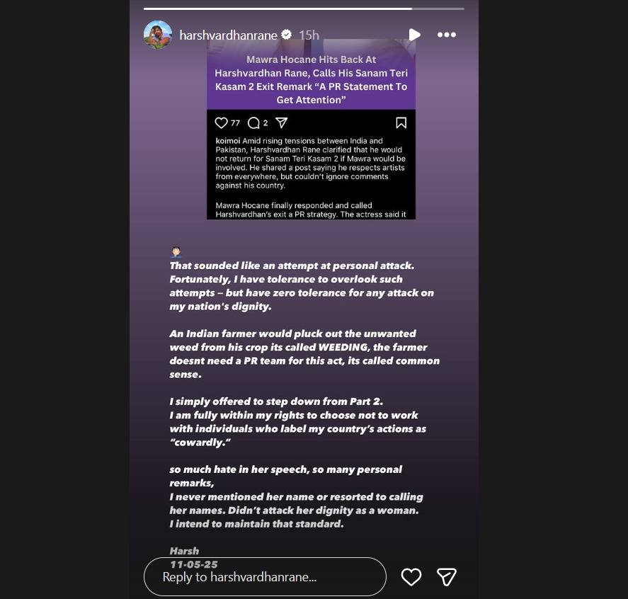अब एक्टर हर्षवर्धन राणे ने मावरा को मुंहतोड़ जवाब दिया. उन्होंने अपनी इंस्टाग्राम स्टोरीज पर लिखा, ‘यह पर्सनल अटैक की तरह लग रहा है. मैं इन सारे प्रयासों को नजरअंदाज कर सकता हूं लेकिन मेरे देश की गरिमा पर किसी भी हमले के लिए जीरो टालरेंस हैं. एक भारतीय किसान अपनी फसल से खरपतवार को उखाड़ता है.