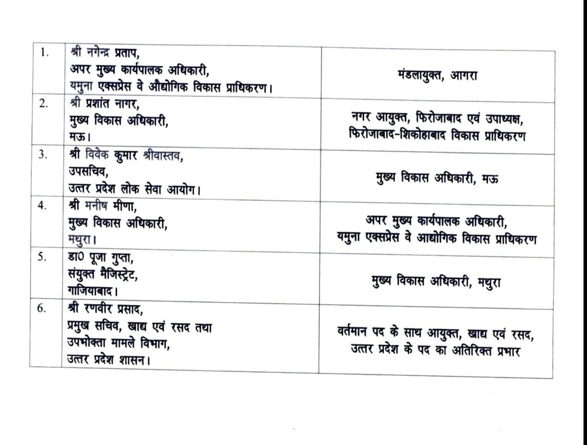 IAS Transfer: उत्तर प्रदेश सरकार ने शनिवार शाम को 6 आईएएस अफसरों के तबादले किए। इसमें नगेंद्र प्रताप को मंडलायुक्त आगरा बनाया गया है। प्रशांत कुमार को नगर आयुक्त फिरोजाबाद एवं उपाध्यक्ष फिरोजाबाद—शिकोहाबाद विकास प्राधिकरण, विवेक कुमार श्रीवास्तव को मुख्य विकास अधिकारी मऊ, मनीष मीणा को अपर मुख्य कार्यपालक अधिकारी, यमुना एक्सप्रेसवे आद्योगिक विकास प्राधिकरण, डॉ पूजा गुप्ता को मुख्य विकास अधिकारी मथुरा और रणवीर प्रसाद को वर्तमान पद के साथ आयुक्त खाद्य एवं रसद, उत्तर प्रदेश के पद का अतिरिक्त प्रभार दिया गया है।