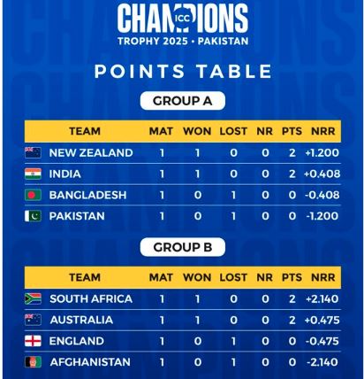 ICC चैंपियंस ट्रॉफी 2025 के ग्रुप स्टेज मुकाबलों में रविवार को खेले गए भारत (India) बनाम पाकिस्तान (Pakistan) मैच के बाद अंक तालिका में बड़े बदलाव हुए। इस हाई-वोल्टेज मुकाबले में भारत (India) ने पाकिस्तान (Pakistan) को 6 विकेट से हराकर टूर्नामेंट में अपनी स्थिति और मजबूत कर ली।