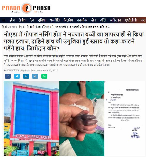 नोएडा। नोएडा के दादरी में स्थित गोपाल नर्सिंग होम (Gopal Nursing Home) ने नवजात बच्ची के जीवन के साथ खिलवाड़ किया, जिसके कारण नवजात बच्ची ने अपने दाहिने हाथ की हथेली खो दी। उत्तर प्रदेश के प्राइवेट अस्पतालों का बढ़ते खौफ को लेकर मंगलवार को स्वास्थ्य मंत्री ब्रजेश पाठक (Health Minister Brajesh Pathak) से पर्दाफाश के संपादक मुनेंद्र शर्मा (Editor Pardaphash Munendra Sharma) ने मुलाकात की। पर्दाफाश में प्रकाशित खबर को संज्ञान में लेते हुए स्वास्थ्य मंत्री ब्रजेश पाठक (Health Minister Brajesh Pathak) ने गौतमबुद्धनगर के सीएमओ को फोन कर गोपाल नर्सिंग होम को तत्काल सील करने आदेश दिया है।