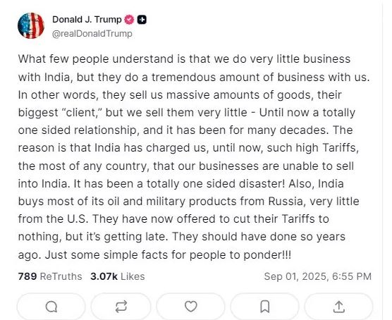 ट्रंप का ये बयान तब आया है जब चीन के तियानजिन में एससीओ समिट की बैठक हुई, जिसमें पीएम मोदी भी शामिल हुए। सोशल मीडिया साइट ट्रुथ सोशल पर अमेरिकी राष्ट्रपति ट्रंप ने लिखा, बहुत कम लोग यह समझते हैं कि हम भारत के साथ बहुत कम व्यापार करते हैं, जबकि वह हमारे साथ बहुत ज्यादा व्यापार करते हैं।