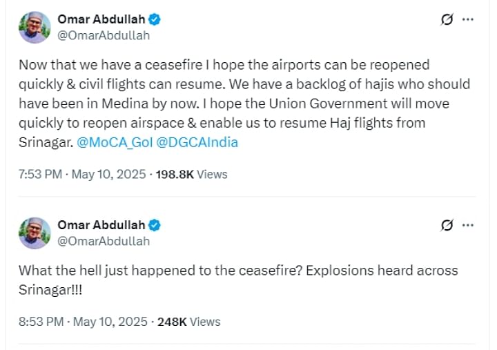 जम्मू-कश्मीर के सीएम उमर अब्दुल्ला ने ट्वीट किया कि संघर्ष विराम को क्या हो गया? श्रीनगर में विस्फोटों की आवाजें सुनी गईं।