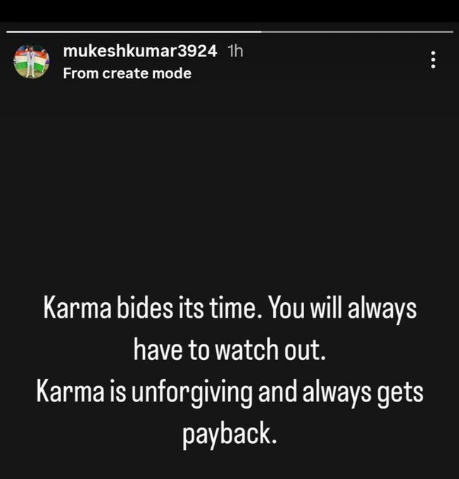 18 जून को भारत लौटने के बाद मुकेश ने इंस्टाग्राम पर एक स्टोरी में लिखा, “हर कर्म का अपने समय से हिसाब होता है। आपको हमेशा सतर्क रहना चाहिए क्योकि कर्मों की माफी नहीं होती और वो बदला जरूर लेते हैं।” माना जा रहा है कि यह पोस्ट कहीं न कहीं टेस्ट टीम के चयन से जुड़ी नाराजगी को दर्शाता है। गेंदबाज का यह मैसेज कोच गौतम गंभीर और सिलेक्टर्स के लिए था, जिन्होंने उनकी जगह हर्षित राणा को मौका दिया।
