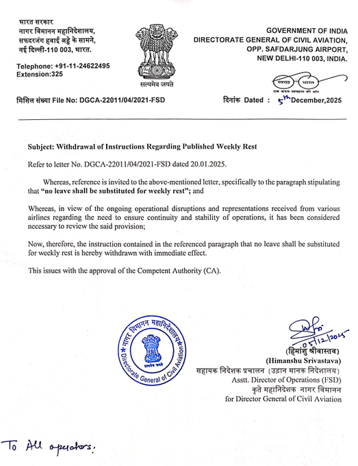 दरअसल, डीजीसीए (DGCA) ने पहले निर्देश जारी किए थे कि क्रू सदस्यों (Guidelines for Crew) को साप्ताहिक विश्राम (Weekly Rest) के बदले कोई भी अवकाश नहीं दिया जाएगा। इस नियम का उद्देश्य पायलटों और केबिन क्रू की थकान को कम करना था, लेकिन एयरलाइनों का कहना था कि इससे रोस्टर प्रबंधन बुरी तरह प्रभावित हो रहा है और उड़ानों के संचालन में बाधा आ रही है। एयरलाइनों के संगठन ने डीजीसीए (DGCA) को सौंपे अपने अभ्यावेदन में बताया था कि मौजूदा ‘परिचालन व्यवधानों’ से निपटने और उड़ानों की निरंतरता बनाए रखने के लिए नियमों में लचीलेपन की आवश्यकता है।