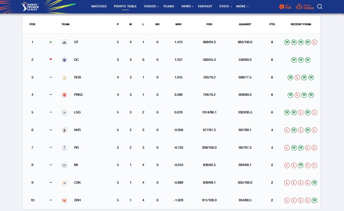 गुजरात टाइटंस ने राजस्थान रॉयल्स को हराकर पॉइंट्स टेबल में दिल्ली कैपिटल्स से नंबर-1 की गद्दी छीन ली है। गुजरात के इस सीजन में चार मैच जीत के साथ आठ अंक है। दिल्ली कैपिटल्स अब दूसरे नंबर पर आ गई है, जिसके 3 मैचों में तीन जीत के साथ 6 अंक हैं। जिसके बाद तीसरे नंबर पर रॉयल चैलेंजर्स बेंगलुरु और चौथे नंबर पर पंजाब किंग्स हैं। दोनों के चार मैचों में तीन जीत के साथ 6-6 अंक हैं। इसके बाद पांचवें नंबर पर ऋषभ पंत की अगुवाई वाली लखनऊ सुपर जायंट्स है, जिसने तीन जीत के साथ 6 अंक हासिल कर लिए हैं। कोलकाता नाइट राइडर्स और राजस्थान रॉयल्स की टीमें 5-5 मैच मैच खेलने के बाद चार-चार अंक लेकर क्रमशः छठे और सातवें नंबर पर हैं।
